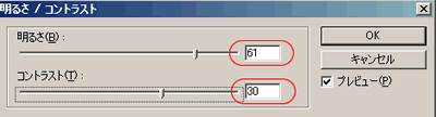 今回は、明るさ61・コントラスト30に設定しました。プレビューでみて自分の目で確認しながら調整してください。